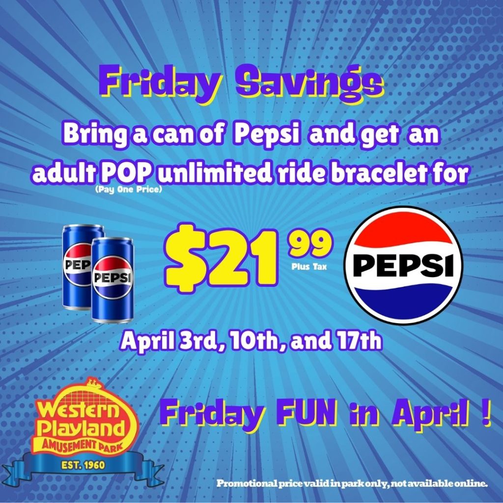 Have fun and SAVE MONEY on Fridays in April. Bring a Pepsi can and get an adult…