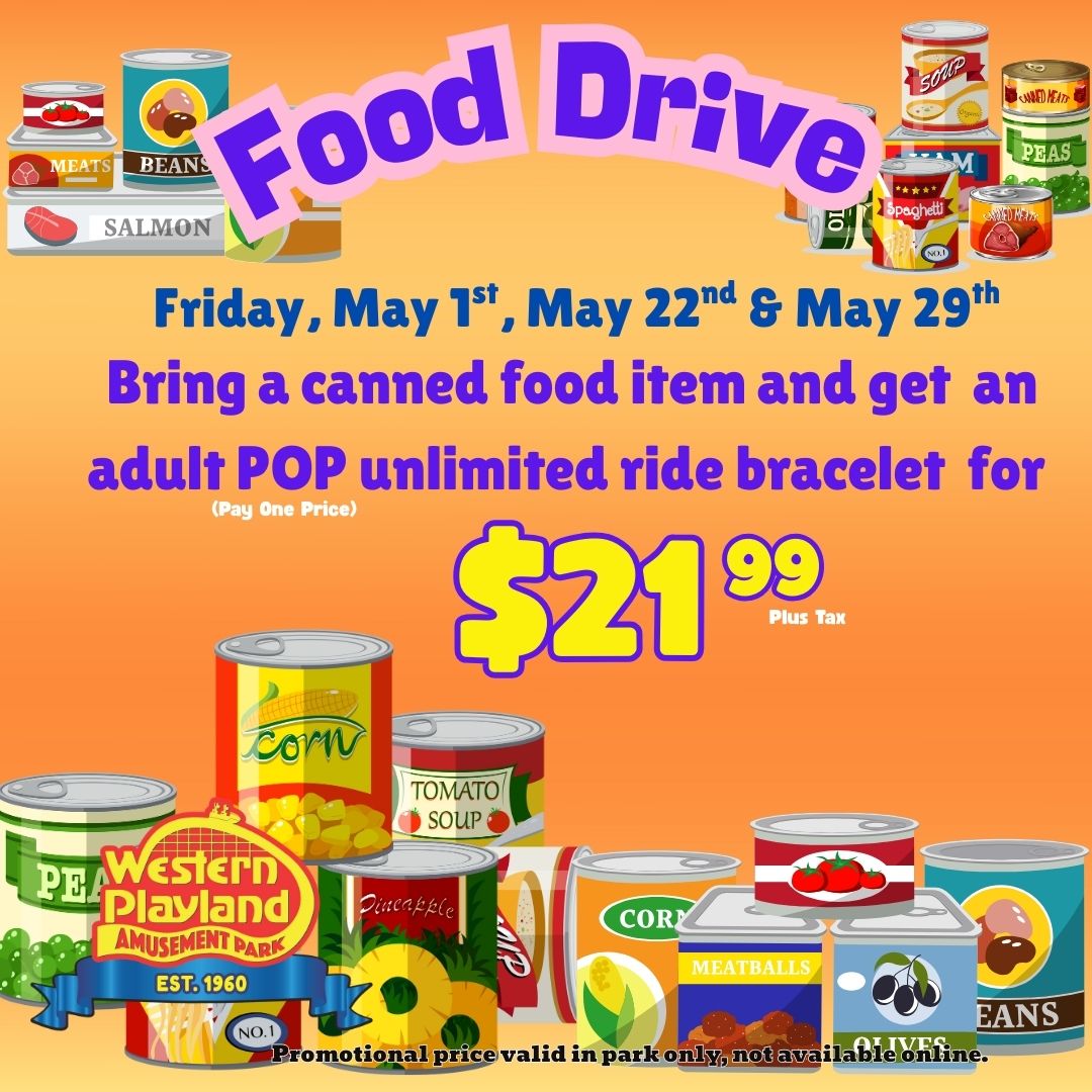 Bring a canned food item and get an adult Pay One Price unlimited ride bracelet for only $21.99 plus tax on Friday, May 1st, May 22nd and May 29th. Help us support our local food banks . |