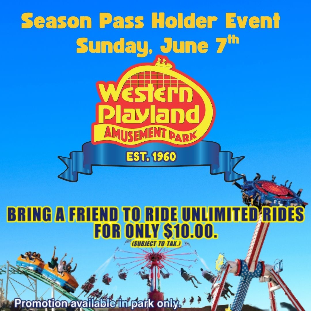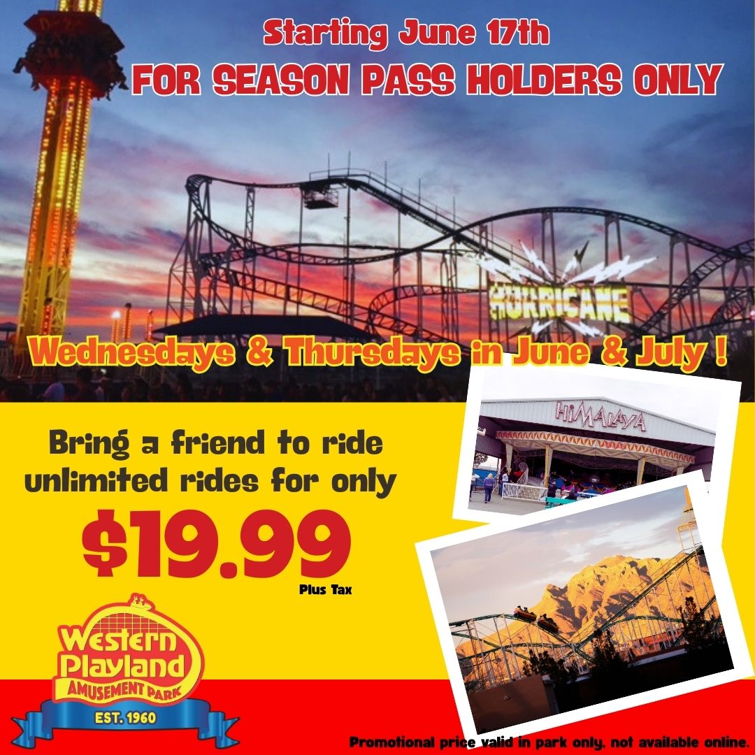 Attention Season Pass Holders! Starting June 17th, you can bring a friend to Western Playland, and they'll enjoy unlimited rides all day long for just $19.99 plus tax every Wednesday and Thursday in June and July. Have some summer fun and save. Don’t miss out!