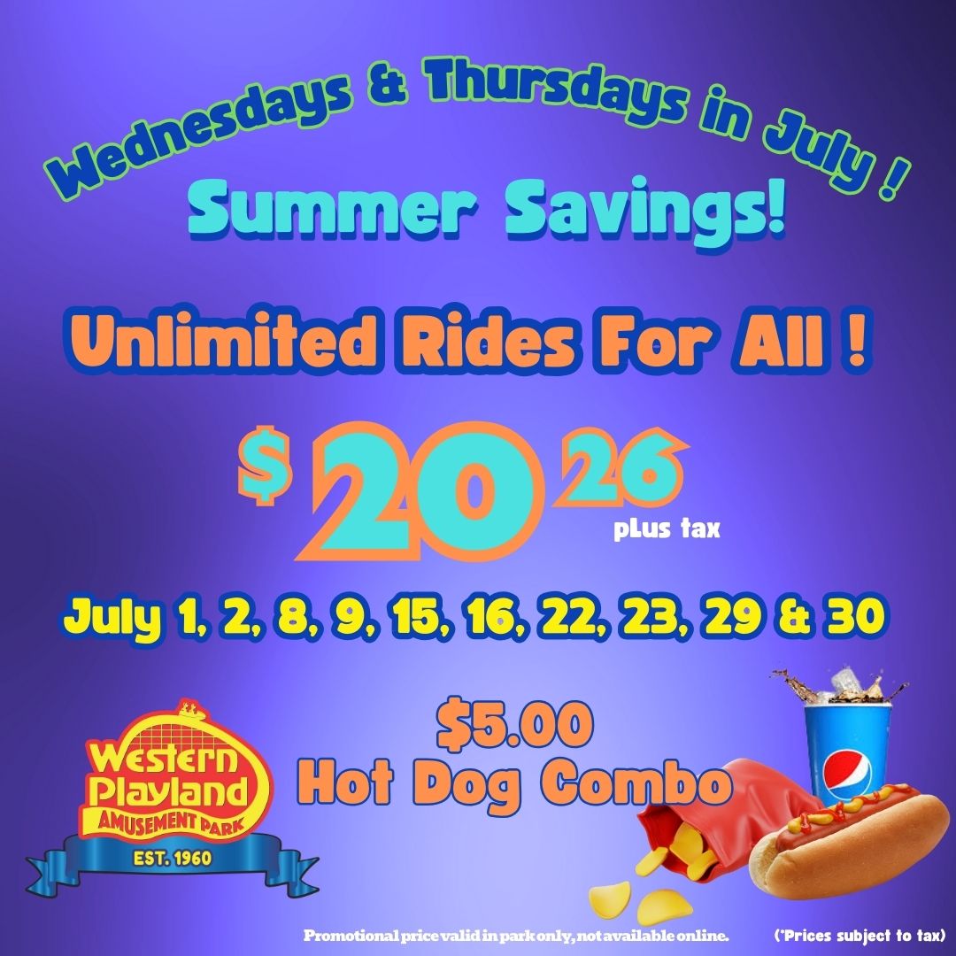 Unlimited rides July 1, 2, 8, 9, 15, 16, 22, 23, 29 and 30 for only $20.26 plus tax. What great savings! PLUS, indulge in our hot dog special for only $5.00 plus tax. Family fun and endless rides every Wednesday and Thursday in July . |